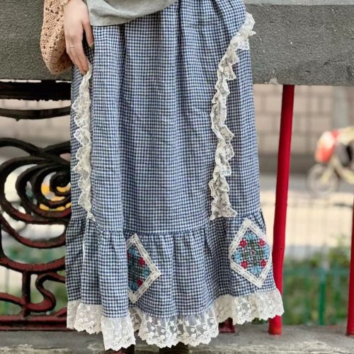 Prairie Style Lace Trim Plaid Skirt